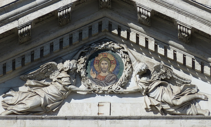 In 1732 Pope Clement XII decided the basilica needed a new façade. Only one thing of the old façade was retained: the central part of the mosaic by Jacopo Torriti which decorated it. In addition Pope Clement XII chose to repeat the old dedicatory inscription, although he placed it in a less evident position. Fragments of the old inscription in the cloister show that the same "font" was used for the new one.