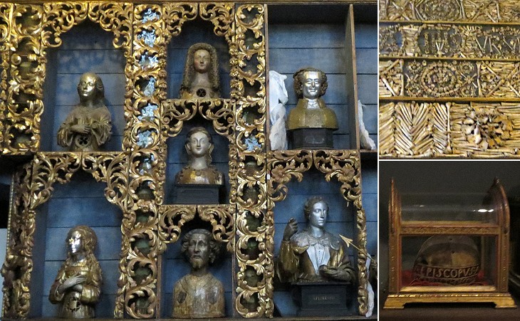 St. Ursula: Golden Room: (left) reliquaries (another one is shown in the image used as background for this page; see also a reliquary of a companion of Ursula at Tongeren and a reliquary of the Saint at Castiglion Fiorentino); (right) bones and the skull of a bishop