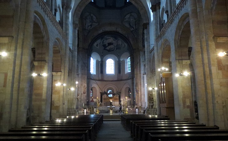 During the XIXth century the interior was redesigned and two towers were added to the original building. WWII bombings and fires caused the collapse of all the ceilings and only a few walls stood still at the end of the conflict. For many years it was thought to leave the ruined church as a memorial to the war. Eventually it was decided to rebuild it and in 1985 it was reopened. The design of the interior reflects the medieval Romanesque aspect of the church.