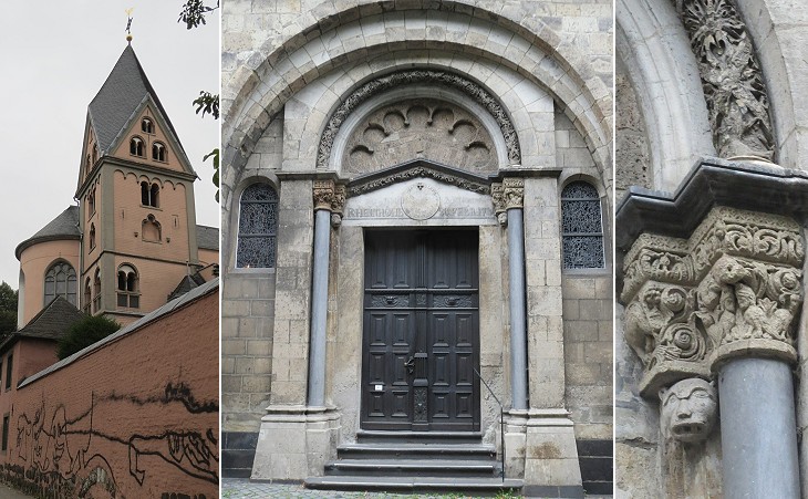 St. Maria Lyskirchen is named after a Lisolph who founded it in 948, but it was rebuilt in the early XIIIth century. Its towers were redesigned in the XIXth century; in the same period a cycle of XIIIth century paintings depicting episodes of the Old and New Testament was discovered in the ceiling of the nave. The building and in particular its Romanesque portal were not significantly damaged during WWII; the portal has a multifoil arch decoration which brings to mind Moorish or Mudéjar buildings in Spain.