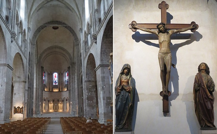 St. Ursula: (left) interior with a Romanesque nave (early XIIth century) and a Gothic choir (XIIIth century), a feature which can be noticed also in many French churches, e.g. at Bordeaux; the church was greatly damaged during WWII; (right) medieval silver tabernacle