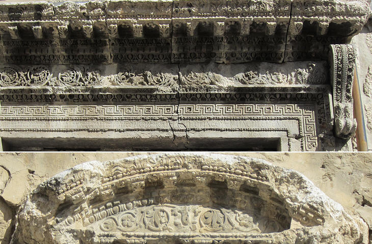 Temple to Jupiter: (above) lintel of the southern entrance to the temple with an inscription stating that it had been turned into a church; (below) detail of a window