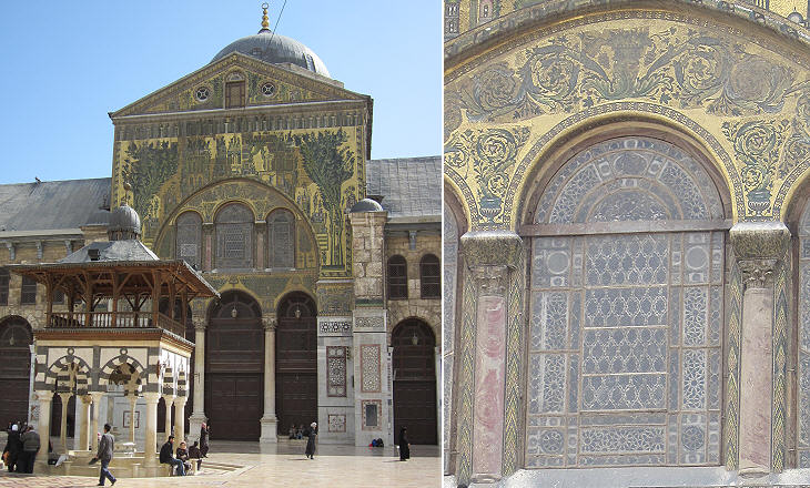 The art of mosaic saw a great development during the Late Roman Empire; the villas near Antioch were decorated with large and elaborate mosaics depicting mythological events; fine mosaics have been found also in the region of Apamea which is close to Damascus; the use of mosaics continued during the Byzantine rule of Syria and the Arabs were impressed by the mosaics they saw in the ancient buildings. Caliph al-Walid decided to decorate the four sides of the courtyard with mosaics. Due to damage caused by the Mongols and Timur, only the western portico and a small section of the northern one retain the original mosaics.