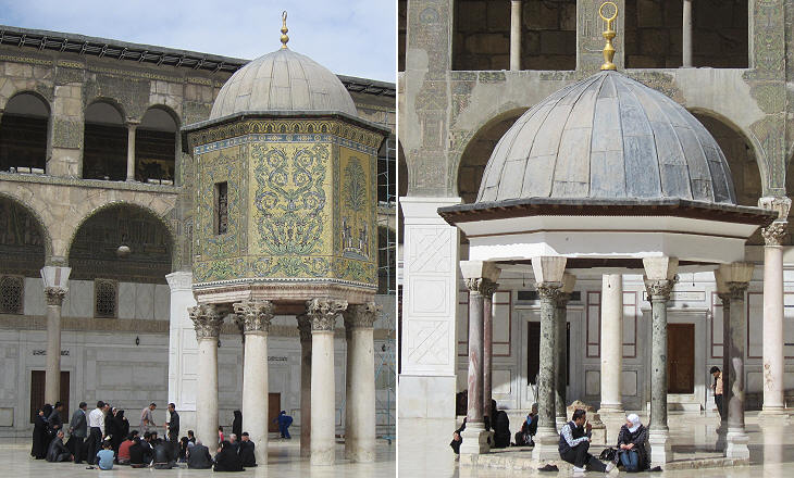 A fountain for ablutions was built at the centre of the courtyard, but it was not enough to "fill" that large empty space; for this reason towards the end of the VIIIth century two small pavilions were built near the northern corners of the courtyard (their domes belong to a later period); their design, size and location (which is not aligned with the central fountain) show a careful analysis of the issue and a very good solution.