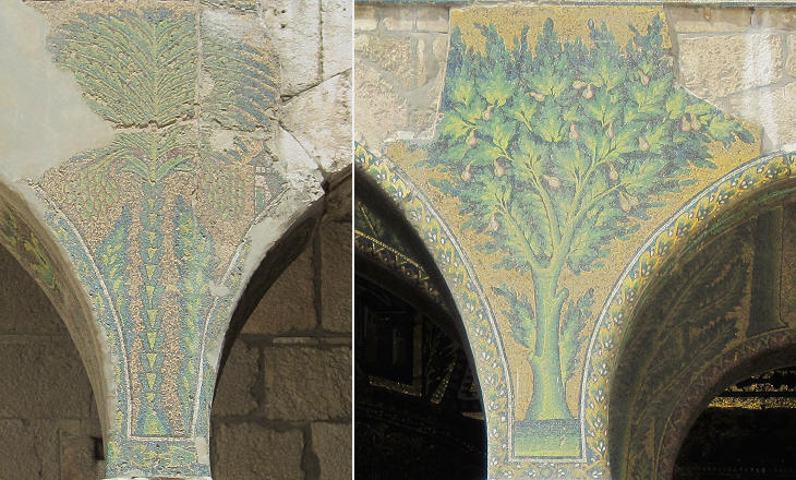 Mosaics depicting a palm (left) and a pear (right)