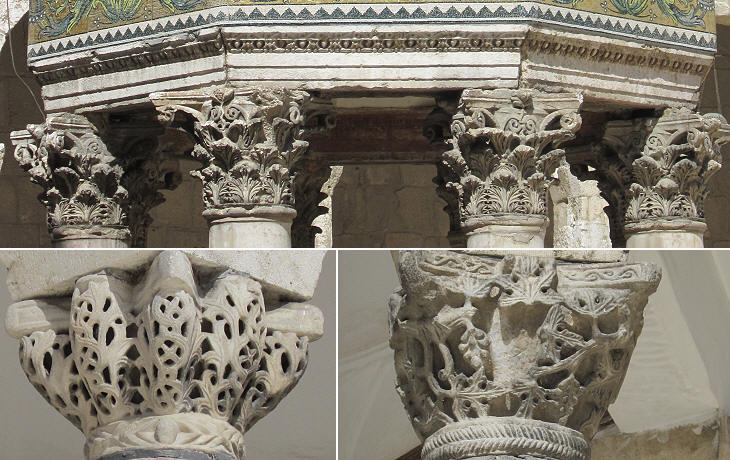(above) Ancient capitals supporting the Treasury; (below) two Byzantine capitals supporting the Dome of the Clock
