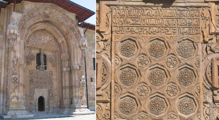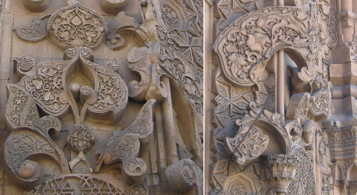 very elaborate. In Divrigi floral motifs are an explosion of life; they are very detached from the background and actual plants seem to climb on the walls. Art historians have identified points in common with Indian monuments and even with the contemporary temples of Angkor.
