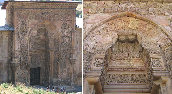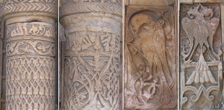 Art historians attribute to Armenian influence the capitals and the design of the columns at the sides of the entrance. The representation of birds is linked to the male (eagle) and female (dove) concepts, but the double-headed eagle was also a symbol of the Sultanate of Rum; when the complex of Divrigi was built the Menguceks were vassals of that nation. The technique is very unusual because the birds are clearly detached from the background, but at the same the relief showing their details is very low.