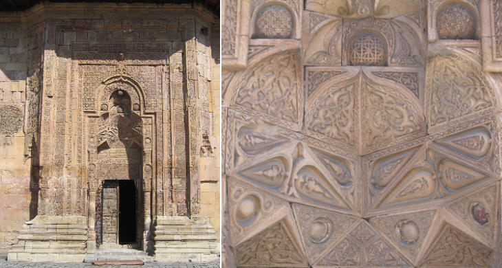 Ulu Cami: (left) eastern portal; (right) detail of its decoration