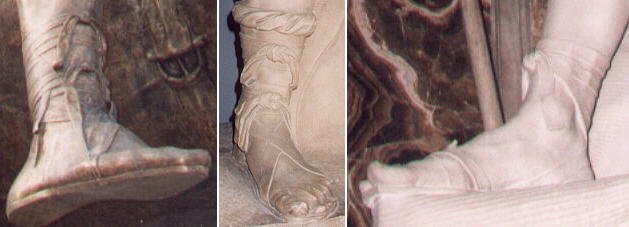 Another comparison between ancient and modern sandals is offered by the statues of Marcus Aurelius and St. Longinus. The sandal of the Roman emperor shows that the sole is held only by a couple of straps. As I had some doubts on this design I checked on other statues and I found that actually this kind of sandals had only one couple of straps holding the sole. Bernini had surely in mind Marcus Aurelius' sandals in the design of St. Longinus, but he preferred to provide the Roman centurion with a sandal with two couples of straps, thus ensuring a firmer adherence of the sole to the foot.