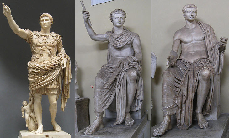 Musei Vaticani: Barefoot Emperors: (left to right) Augustus (the statue is shown also in the image used as background for this page), Tiberius, Claudius (?)