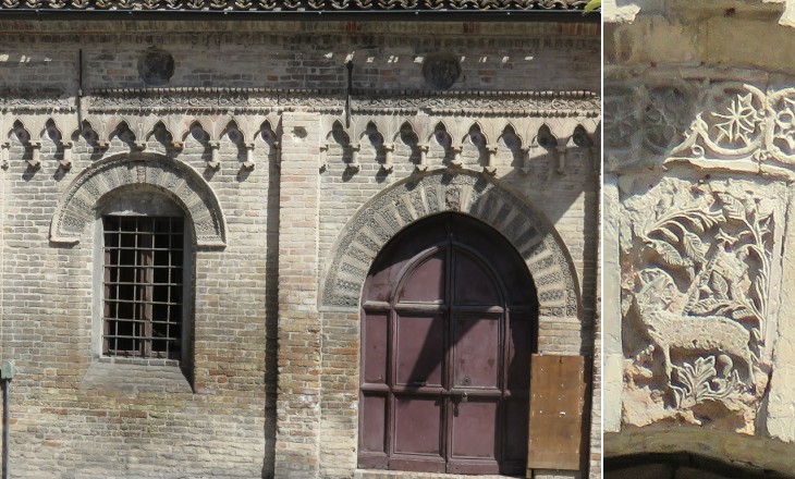 S. Zenone: (left) façade (1171) and bell tower (1228); (centre/right) portal (1186) which incorporates medieval and Roman materials