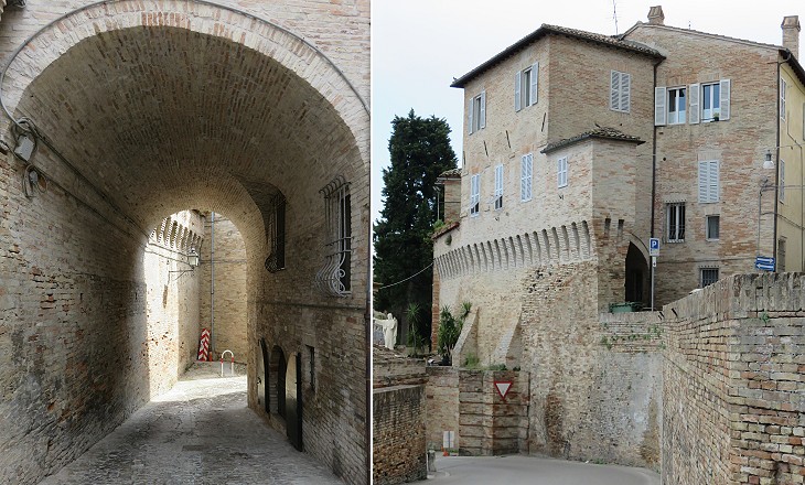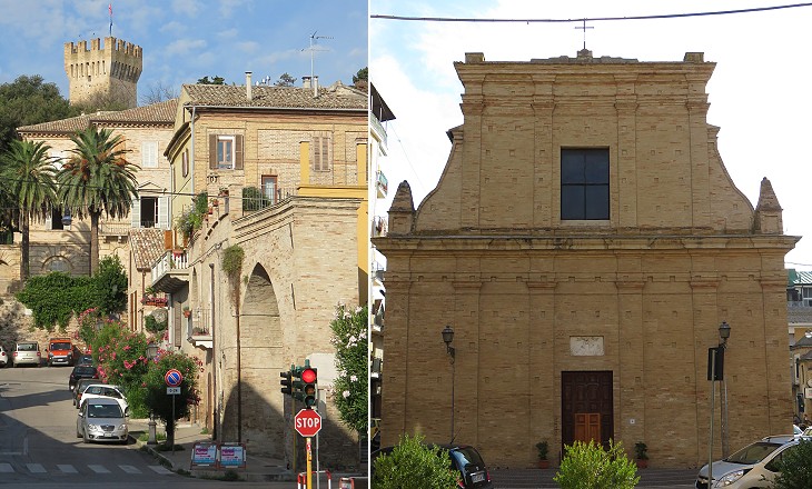 Porto San Giorgio: (left) pointed arch of the walls protecting the harbour and behind it Villa Caterina (aka Pelagallo) with a tower which was part of the walls; (right) S. Maria del Suffragio (XVIIth century)