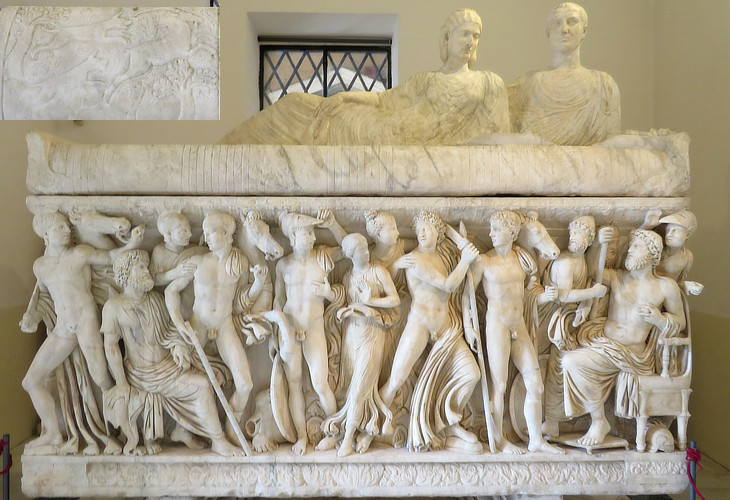Musei Capitolini: the actual sarcophagus; (inset) detail of the embroidered cushion which is very similar to one from Perge