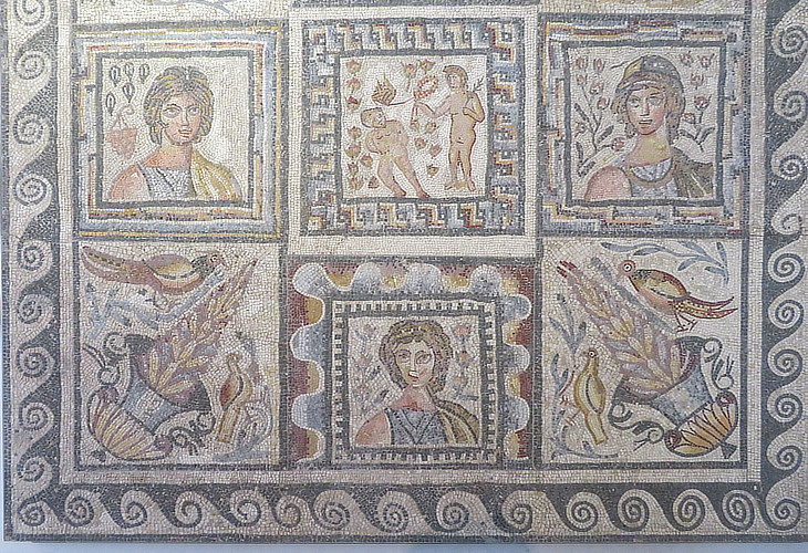 Museo Nazionale Romano: floor mosaic from near Le Capannelle (IVth/Vth century AD), perhaps part of a mausoleum: it depicts (in a very sketchy way) the Four Seasons and an athlete receiving the wreath of victory