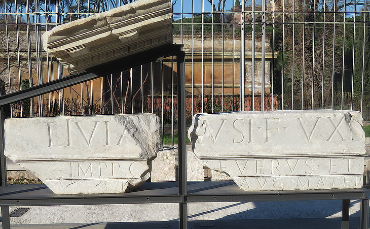 et [Iulia] Aug(usta) mater Aug[g. - restituerunt]. It suggests that a temple built by Livia, third wife of Emperor Augustus, was restored by Emperor Septimius Severus, his two sons Geta and Caracalla and their mother Julia Domna.