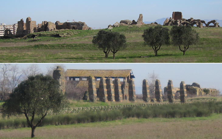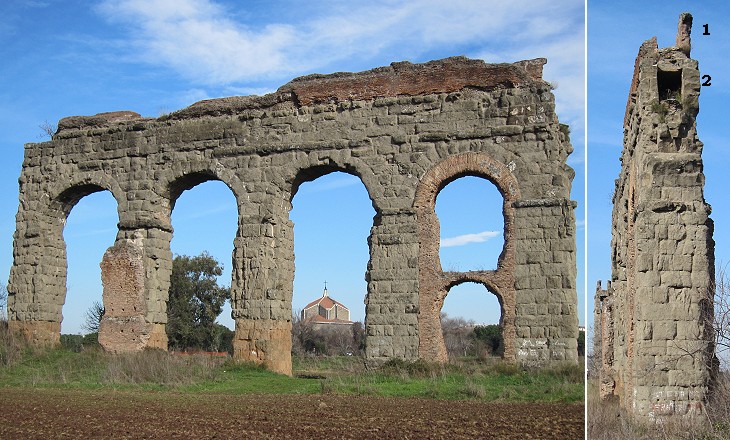 (left) Arches at Parco degli Acquedotti; (right) image showing the two water conduits: 1) "Anio Novus"; 2) "Aqua Claudia"