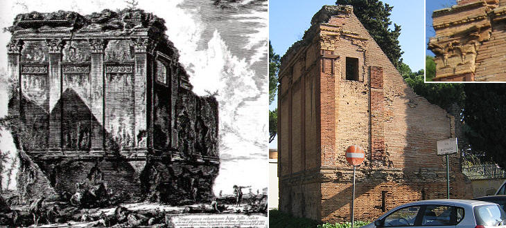 Tempio della Salute is the name given by Giovanni Battista Piranesi to a IInd century AD Roman tomb along Via Appia Nuova approximately one mile from its junction with Via Appia Pignatelli. The comparison between the etching by Piranesi and the actual monument shows how Piranesi dramatized the view by exaggerating the size of the ancient building and by adding some picturesque elements such as the shadow of a pyramid. The tomb is similar to other brick tombs along nearby Via Appia Antica.