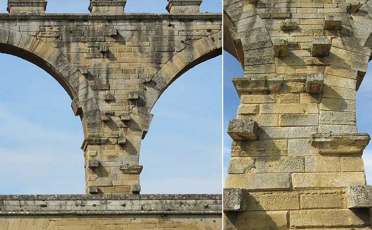 (left) Second row of arches; (right) projecting stones which were used for erecting scaffolding