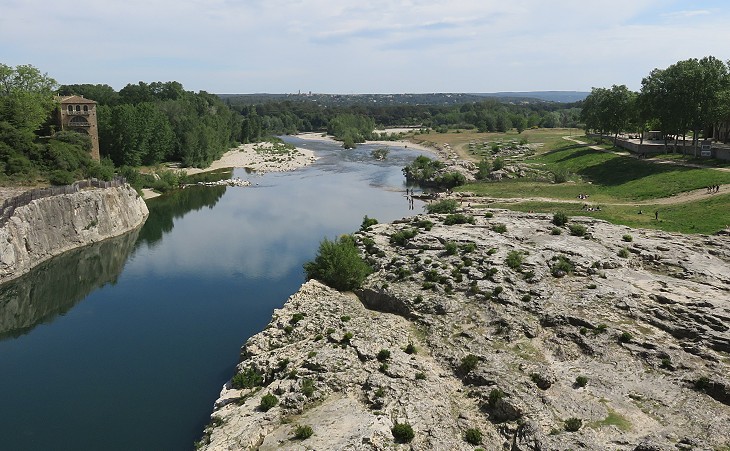 Pont-du-Gard stands over the river Gardon, which is a beautiful pastoral stream, brawling among rocks, which form a number of pretty natural cascades, and overshadowed on each side with trees and shrubs, which greatly add to the rural beauties of the scene. It rises in the Cevennes, and the sand of it produces gold. (..) If I lived at Nismes, or Avignon (which last city is within four short leagues of it) I should take pleasure in forming parties to come hither, in summer, to dine under one of the arches of the Pont du Garde, on a cold collation. Smollett