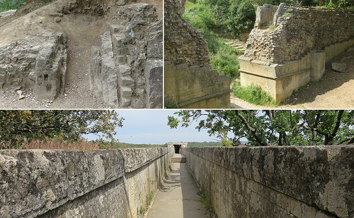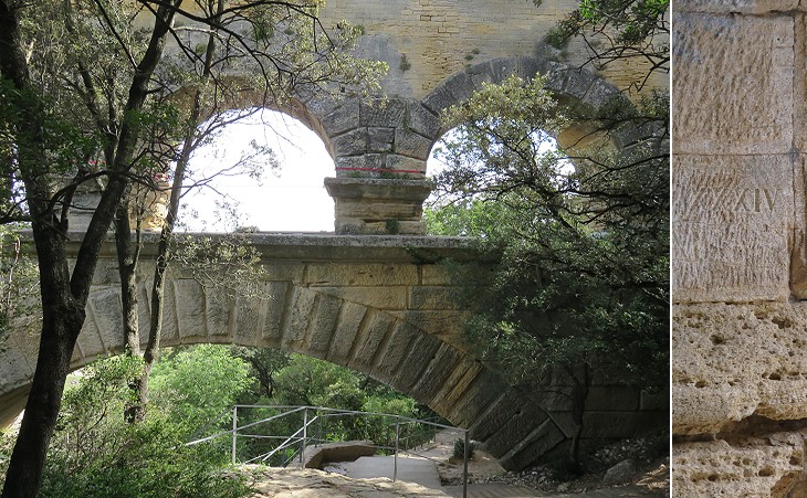 (left) First arches on the right bank hill; (right) stones of the first pier bearing Roman numbers which indicated where they should be placed