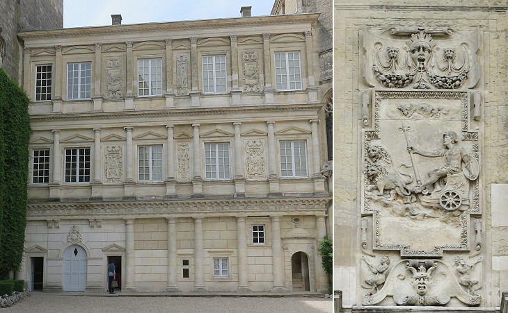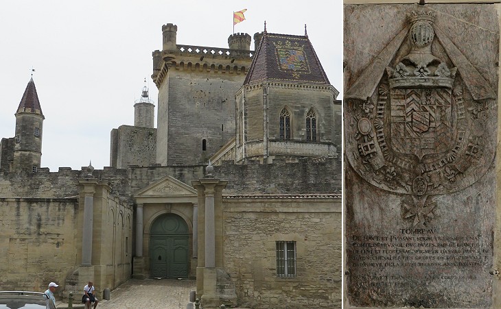 (left) Palais du Duché; (right) gravestone of Emanuel de Crussol (1570-1657), IIIrd Duke of Uzès