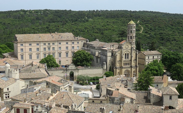 the city Uzès, the capital of a dutchy, as well as bishopric in Lower Languedoc, situated among the