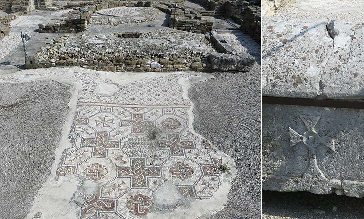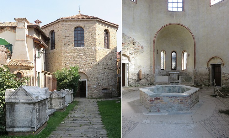 Baptistery: (left) exterior and three ancient sarcophagi; (right) interior with a reconstructed baptismal basin; the image used as background for this page shows a detail of a mosaic in its interior