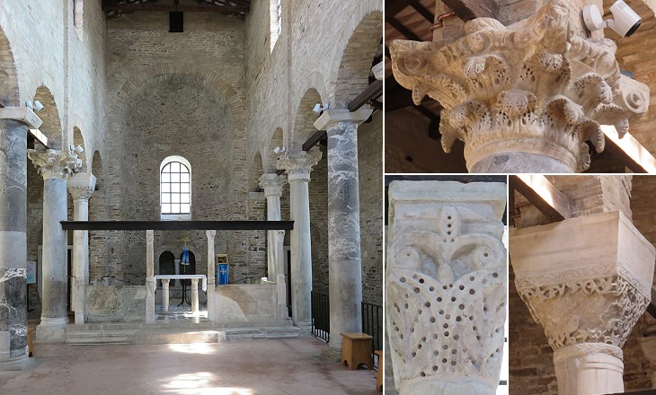 S. Maria delle Grazie: (left) interior; (right) three capitals of different designs and periods