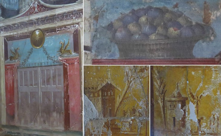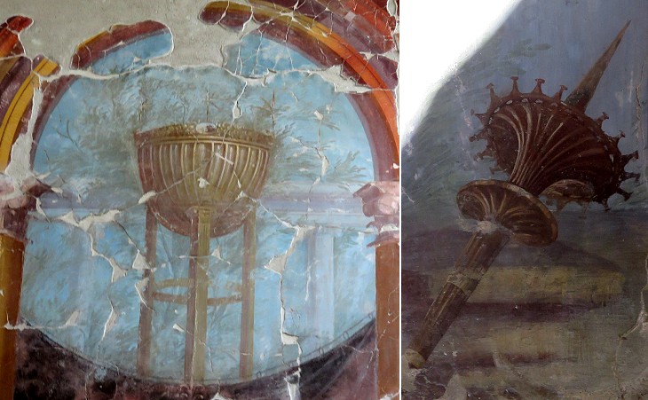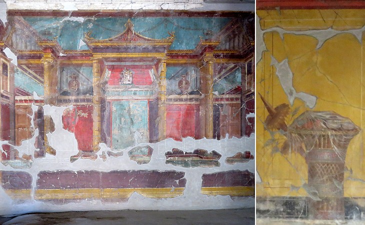 Small room between the atrium and the southern peristyle and a detail of its decoration; the roof at the centre of the fake architecture has a rather Chinese appearance