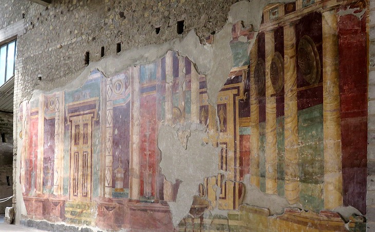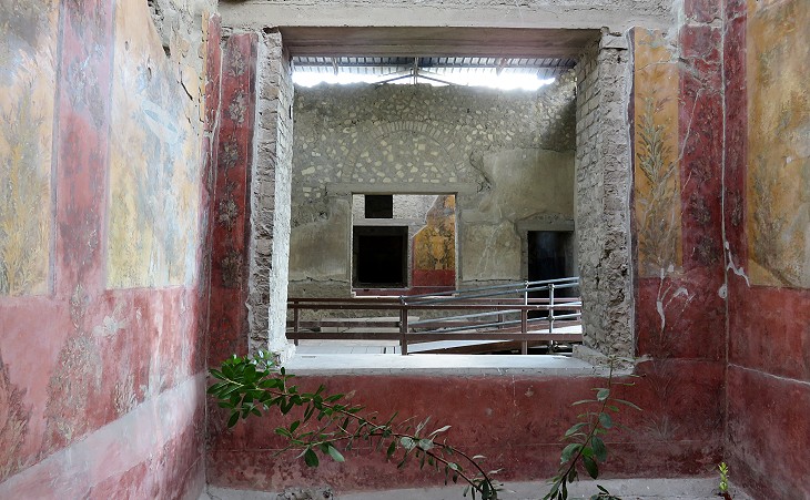 The Great Rear Hall was flanked by two porticoes which were decorated in the fourth style with large red and yellow panels. Because of the lack of remains of food and of other signs of occupancy, archaeologists believe the villa was not populated at the time of the eruption.