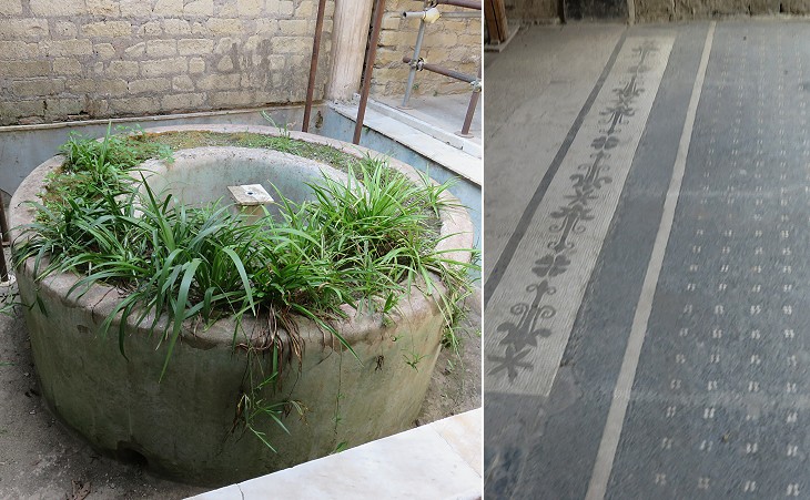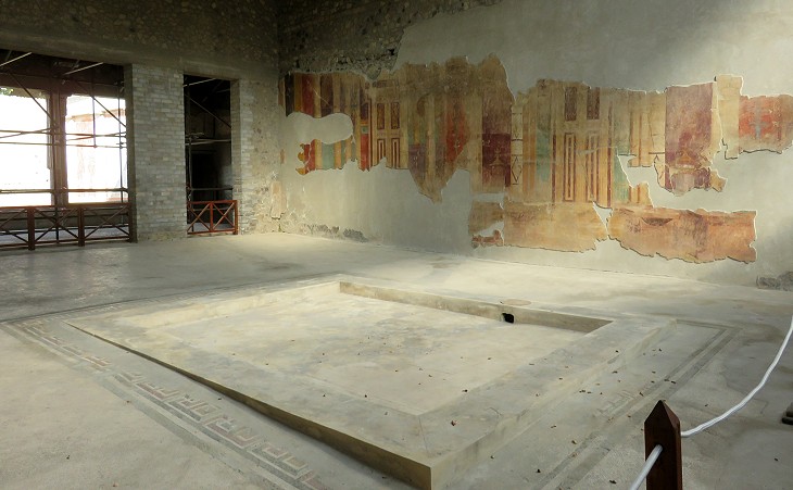 The main front of the villa was on the seaside where most likely additional excavations would find evidence of a landing point. This feature supports the opinion that the landlords and their guests reached and left the villa by sea, which means it is unlikely they were wealthy citizens of Pompeii. The atrium which served as entrance to the villa had an impluvium, a sunken basin for collecting rainwater. It did not have side openings.