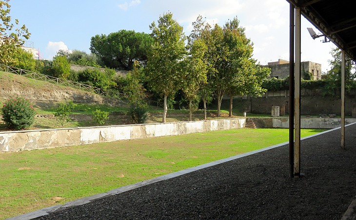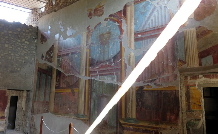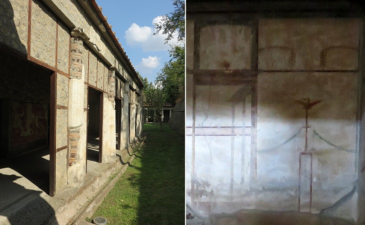 Archaeologists have unearthed three sides of this peristyle. The fourth one either lies beneath the houses of Torre Annunziata or it might have never existed. In this case the courtyard/garden would have had a balustrade facing the sea, which today is some 300 meters away. The porticoes were supported by fluted stucco columns with a brick structure.