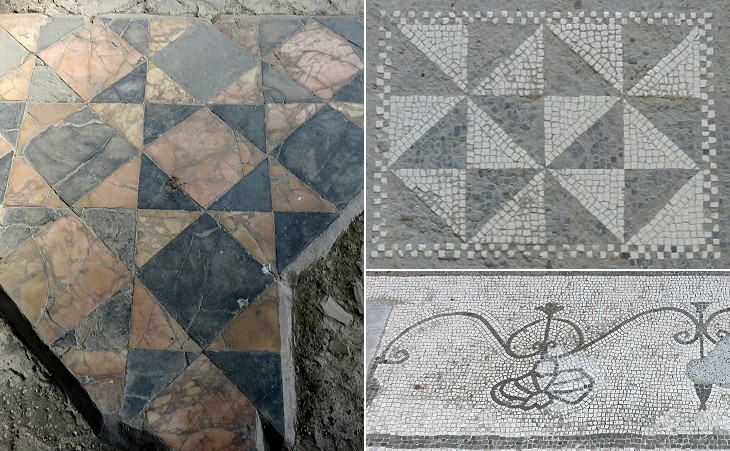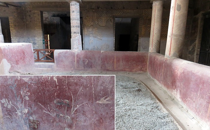 The area to the east of the atrium housed rooms for servants, a latrine, a hall with a lararium and a small peristyle with a low wall which surrounded a garden. It was decorated with white plants and birds against a uniform red background.