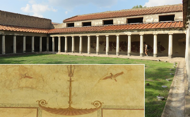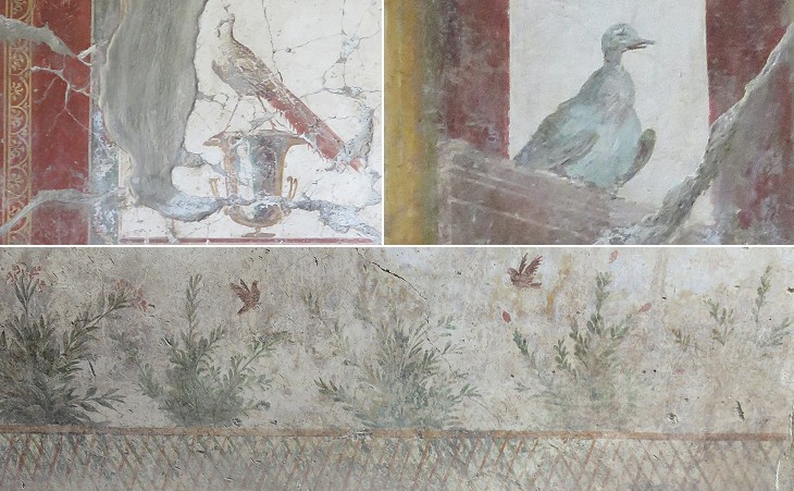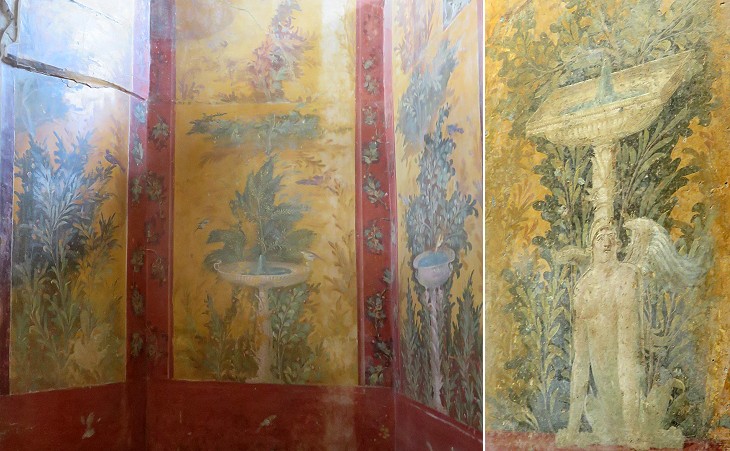 Trees and birds are frequent subjects of Roman paintings (see those at Villa di Livia near Rome), but nowhere else one can see such a rich catalogue of fountains. Those supported by a twisted column or by a sphinx are especially remarkable. It is possible that some of the rooms having a window overlooking these gardens were hospitalia, i.e. rooms for guests (presumably the most distinguished ones).