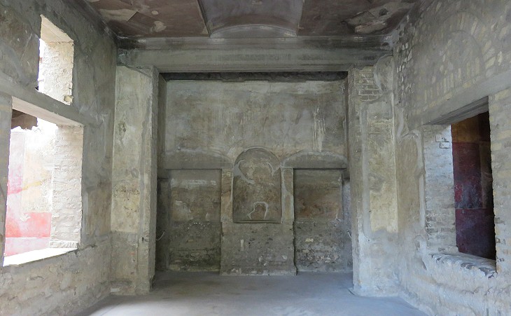 Those who attended the banquet could then move to an adjoining room which had a view over the sea. Only the wall it shares with the triclinium retains its decoration. It is perhaps the most impressive one of the whole villa. It depicts an open door and five windows. In the centre we see the tripod of the Oracle of Delphi which was sacred to Apollo: the legs through the door and the tripod itself through a circular window above it. The four side windows frame two colonnades. Overall the painting is a symbolic depiction of the Temple to Apollo at Delphi.