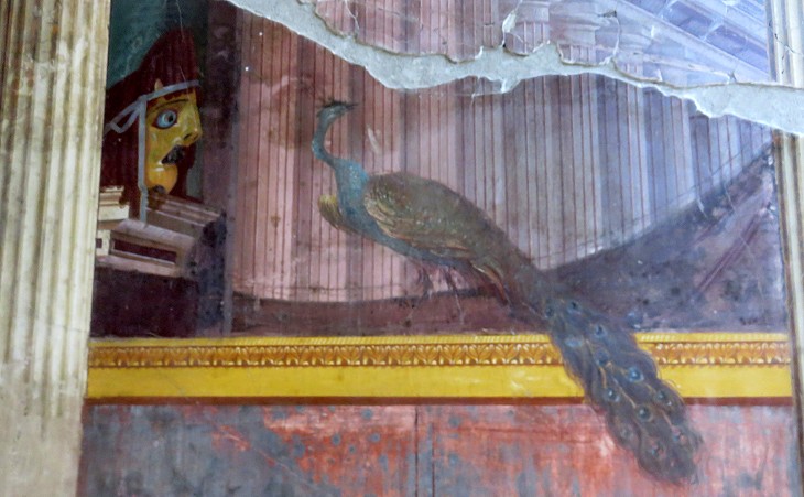 Detail of the Hall of the Tripod showing a theatrical mask and a peacock