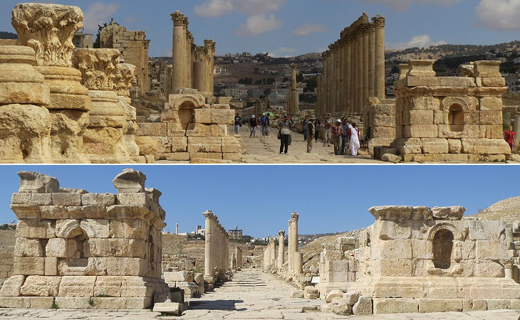 Many columns have been re-erected along Cardo Maximus and other streets of Jerash, so it is not always possible to identify the groups of columns mentioned by Burckhardt.