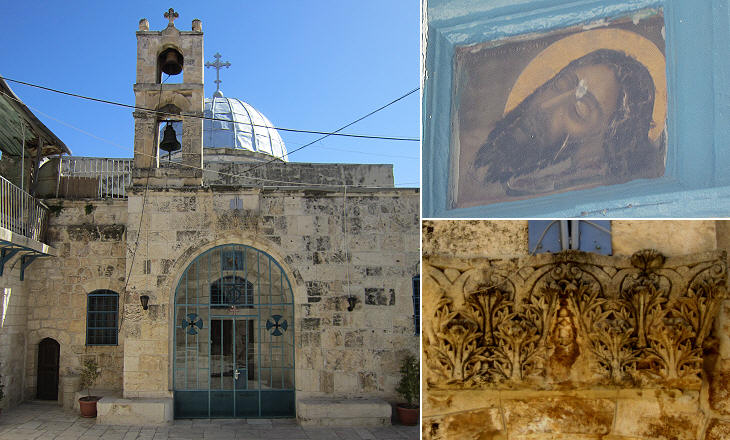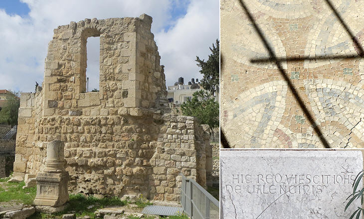 (left) Ruins of a Byzantine church rebuilt by the Crusaders on the site of a Temple to Aesculapius; (right-above) ancient mosaic in a side chapel; (right-below) tombstone of Jean de Valenciennes/Johannes de Valencinis, a French diplomat and the last Christian governor of Kaifah (Haifa) (d. 1265)