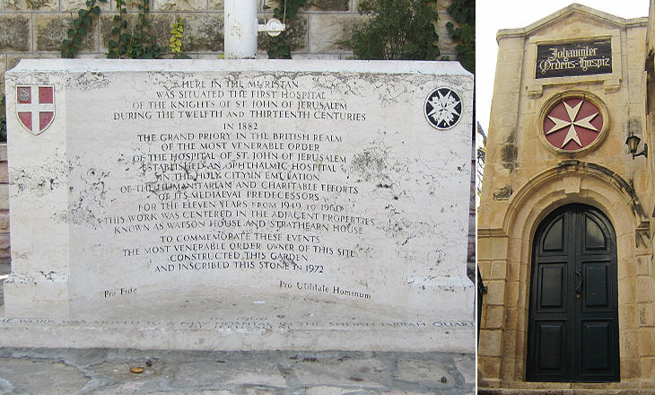 (left) 1882 inscription celebrating the construction of an ophthalmic hospital by the Venerable Order of the Hospital of Saint John of Jerusalem, a British Protestant branch of the Order; (right) entrance to St. John's Hospital founded in 1866 by the German Lutheran Order of St. John