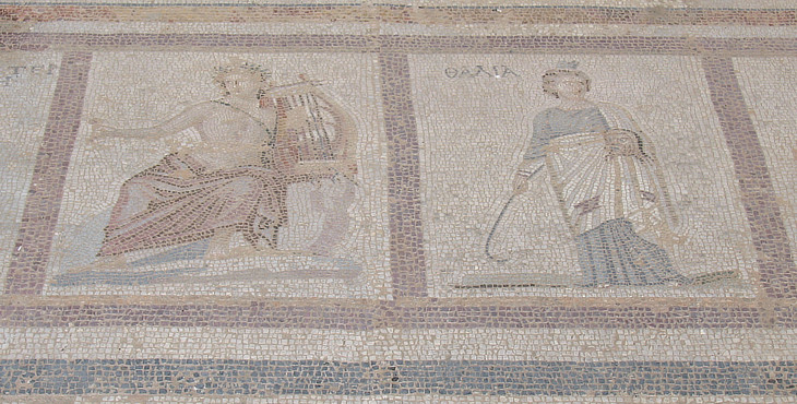 Apollo and Talia, Muse of Comedy; Roman mosaic in the western archaeological area; the usual iconography of the god does not hint to the fact that he often lost his temper