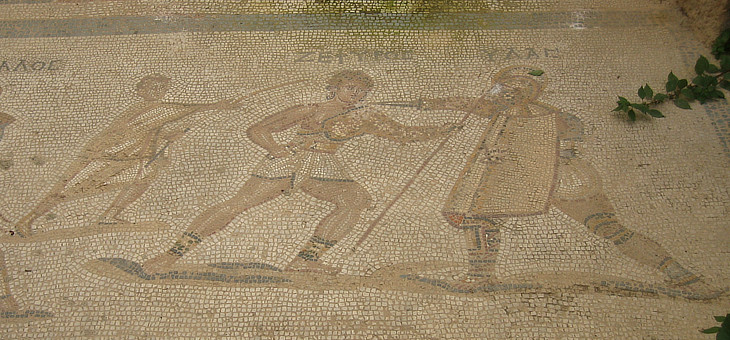 German archaeologists undertook the first excavations in the city in 1900-1904 and some of the finest exhibits they uneathed were moved to the Archaeological Museum of Istanbul. The subject of gladiatorial combats appears to have been very popular because it is depicted also in other floor mosaics which were found in 1922-1943 by Italian archaeologists. That at Istanbul calls to mind a IVth century AD floor mosaic from the environs of Rome.