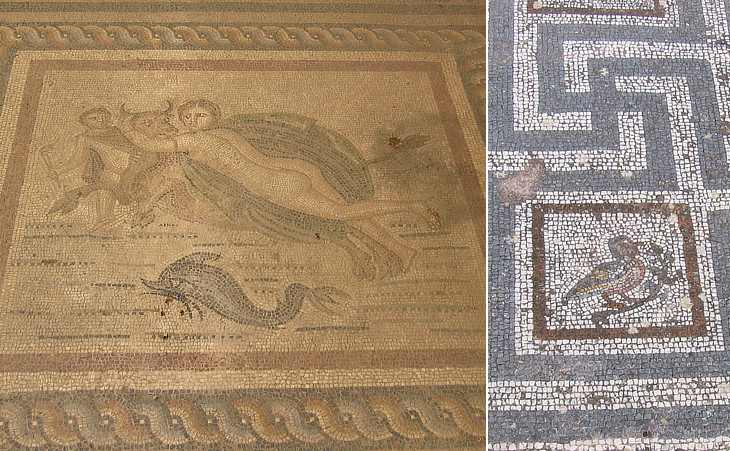Roman mosaics: (left) Abduction of Europa (western archaeological area); (right) a typical Greek geometric pattern with small images of birds