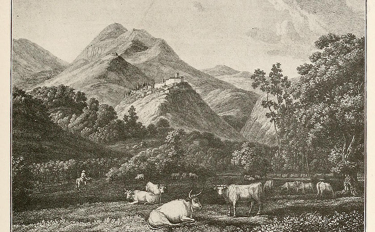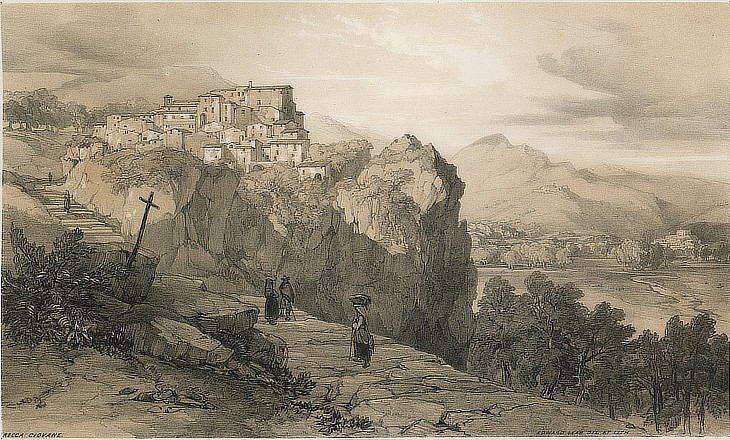 The road then ran at the foot of Mount Lucretilis, and a more beautiful mountain has rarely been discovered by a traveller or celebrated by a poet. It rises in a gentle but irregular swell, forming several hills of different shapes as it ascends, and leading the eye through various easy gradations to its summit. Rocks and precipices frequently break its lines, and open various caverns and grottos in its sides, and on its declivities. Its lower regions are divided into corn fields and vineyards, groves of olives and of chestnuts interspersed with forest, trees thrown negligently about, sometimes single, sometimes in clumps and now and then in woods; its upper parts are healthy pasture, and in many places covered with brambles, shrubs and forests. Herds may be seen ranging through the meadows, and flocks of goats spread over the wilds and browsing on the precipices. Arcadia itself could scarcely have exhibited more beautiful scenes, or opened more delightful recesses; so that Lucretilis, without being indebted to poetical exaggeration for the compliment, might easily be supposed to have attracted the attention of the rural divinities, and allured them to its delicious wildernesses. Eustace