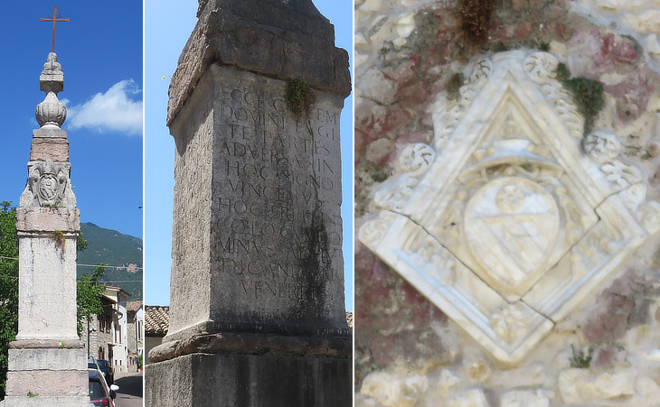 (left) Obelisco della Croce, 1615 small monument at the old entrance to the town; (centre) inscription which in part is a copy of those of Obelisco Vaticano; (right) reconstructed coat of arms of Bishop Mario Orsini on the tower of the castle