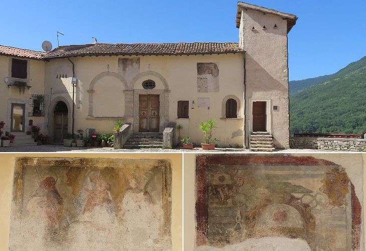 Castello Orsini: (above) western part of the castle; (below-left) fresco portraying the Virgin Mary between two saints; (below-right) coat of arms of Bishop Mario Orsini and above it those of his parents