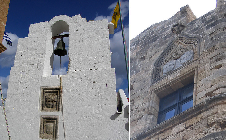 (left) Bell tower of Agia Panagia with the quartered coats of arms of Grand Master d'Aubusson and of the Order; (right) window of the fortress with the same coats of arms