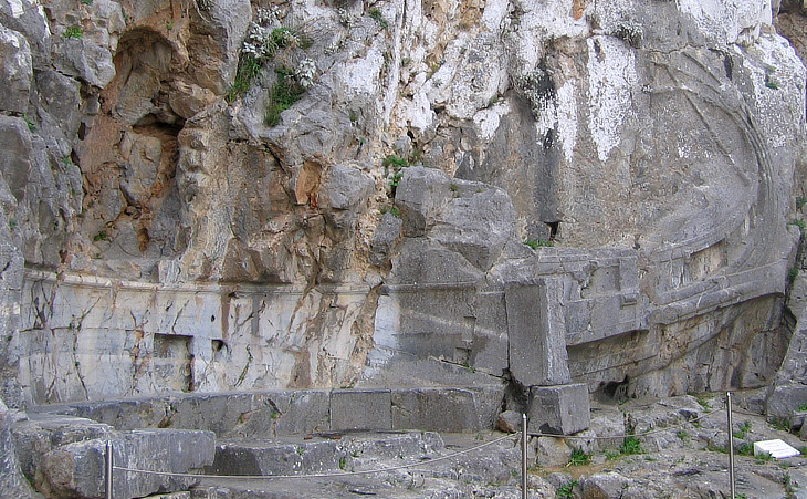 At the foot of the northern side of the acropolis is a large Hellenistic rock-cut relief representing the prow of a ship; a projecting platform carried a statue of Hagesandros, a priest to Poseidon (Neptune), dedicated by himself. The relief was enclosed within the fortress of the Knights. You may wish to compare it with a Roman sculpture of Ulysses' ship at Sperlonga.