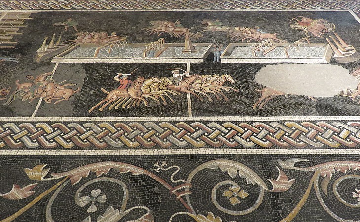 Mosaics and reliefs have provided archaeologists and historians with a visual idea of an actual Roman chariot race and of the monuments, facilities and devices which existed in a circus. In this mosaic we have a clear understanding of how the carceres were opened at the same time by pulling a lever and of how the raising of poles told the spectators the number of remaining laps. In this respect this mosaic is more accurate than other large mosaics, e.g. those found in Sicily, at Girona and Barcelona. Another interesting aspect is that it depicts a certamen binarium, i.e. one in which each of the four factions (Reds, Blues, Greens and Whites) compete with two chariots, while the other mosaics show only one chariot per faction.