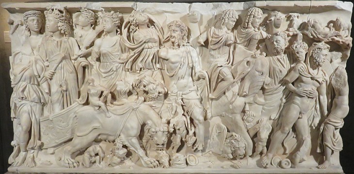 Dr. Comardin suggested a Greek origin for the sarcophagus which instead was made in Italy because its marble is from Luni (Carrara). The Triumph of Bacchus after his victory in India was a very popular tale in many parts of the Roman Empire (see mosaics in Algeria, Tunisia and Spain and a jewel at the Louvre Museum).